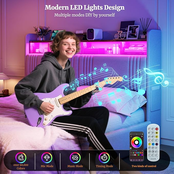 - Convenient Charging Station & LED Lights : Say goodbye to low battery anxiety! Built-in charging station on the storage headboard, equipped with 2 USB ports and 1 Type-C port for easy access to your devices. Elevate your bedroom ambiance with the RGB LED lighting, customizable via remote control or mobile app. You can adjust the color, brightness, mode to create the perfect atmosphere for any occasion