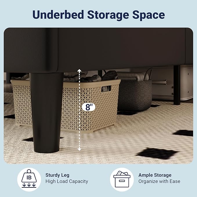 - Under-Bed Storage Space:The bed frame queen offers 8" under-bed space for storage boxes and other essentials. Easy access for vacuum cleaners or robot sweepers keeps your bedroom tidy and organized