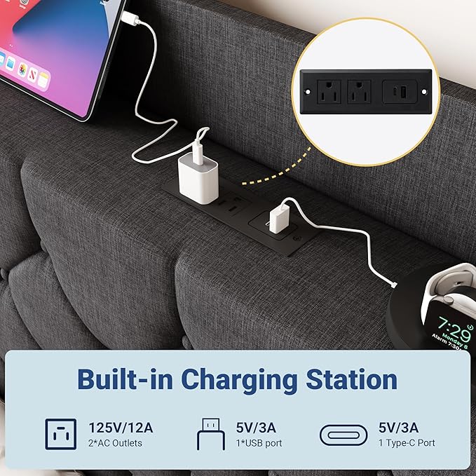 - Power Charging Station: Queen size platform bed with headboard featuring an upgraded Power Charging Station—2 outlets, 1 USB, 1 Type-C port. Charge phones, iPads, lamps, and more without leaving your bed