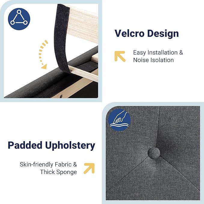 - Noise Free Bed Frame: Full size bed frame with padded upholstered headboard complements any decor. EVA mute bars and quality construction prevent squeaks for quiet, hassle-free use