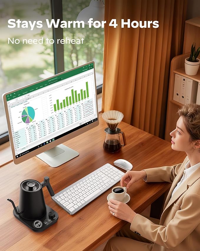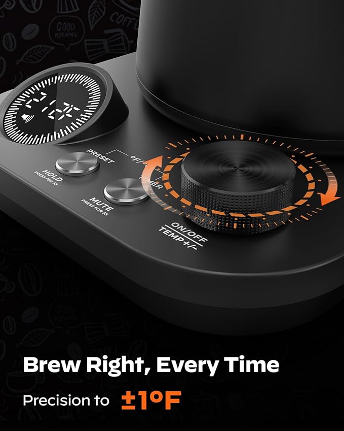 - "Reliable Quality and Precision Temperature: Unlock the full flavor and aroma of your coffee or tea with precise temperature control Easily adjust from 40°F to 212°F, with ±1°F precision to meet your needs . Crafted with a 100% BPA-free, rust-resistant 304 stainless steel interior, this kettle ensures your brew is not only perfect but also safe and built to last."