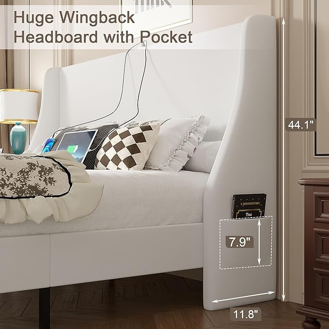 - Upholstered Headboard with Wingback - The wide wingback headboard not only prevents the mattress from slipping and pillows from falling off the bed, but also adds a refined and stylish touch to your bedroom. Upholstered with high-resilience memory foam, offering a soft and breathable surface, ensuring a comfortable backrest experience.