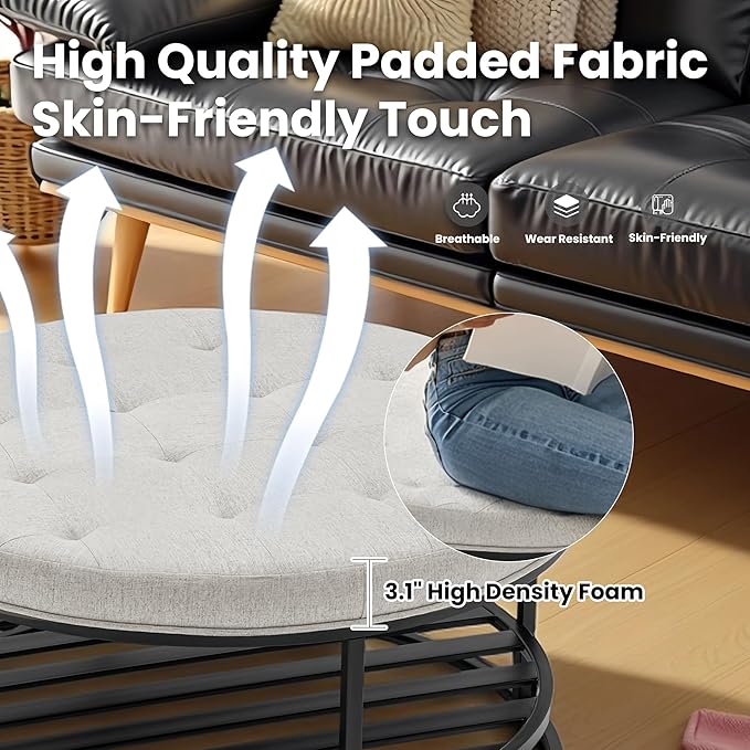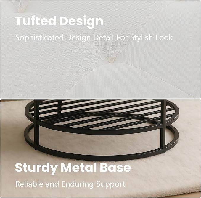 Ottoman Coffee Table with Upholstered Tufted Linen Fabric, Round Center Table with Storage Large Footrest Ottoman for Living Room Cream White