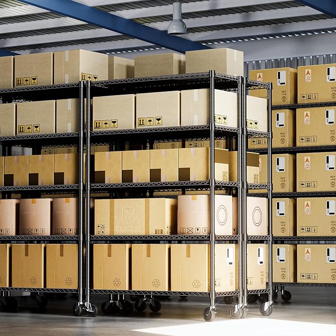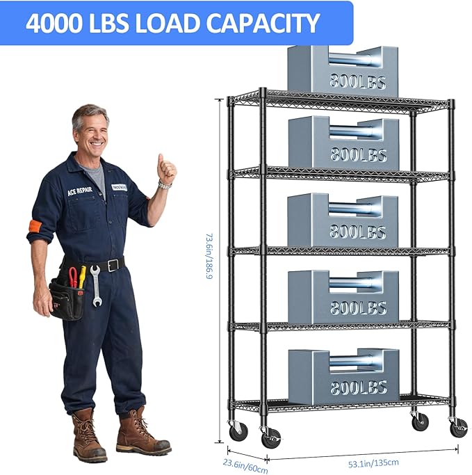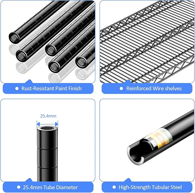 - COMMERCIAL-GRADE HEAVY DUTY – Made from high-quality carbon steel with 25.4mm reinforced rods, this heavy duty garage shelving supports up to 660 lbs per shelf and 2640 lbs total on leveling feet (approx. 530 lbs on wheels).