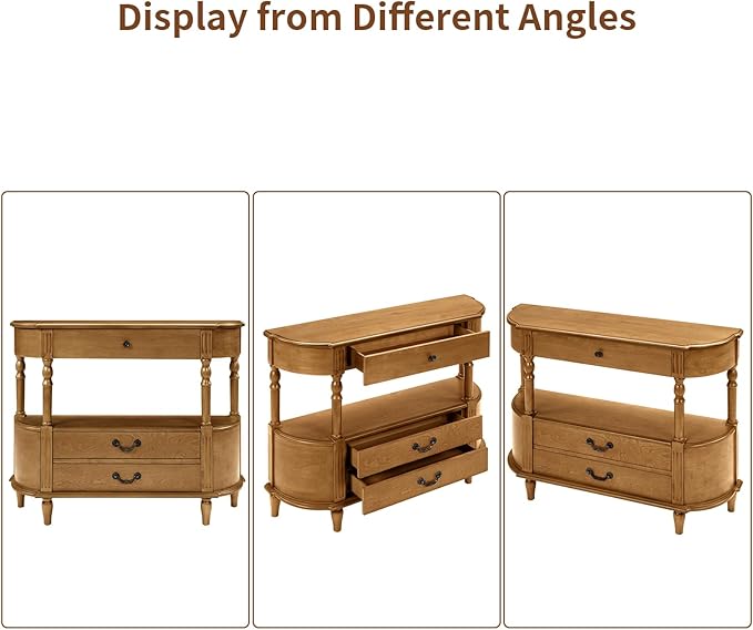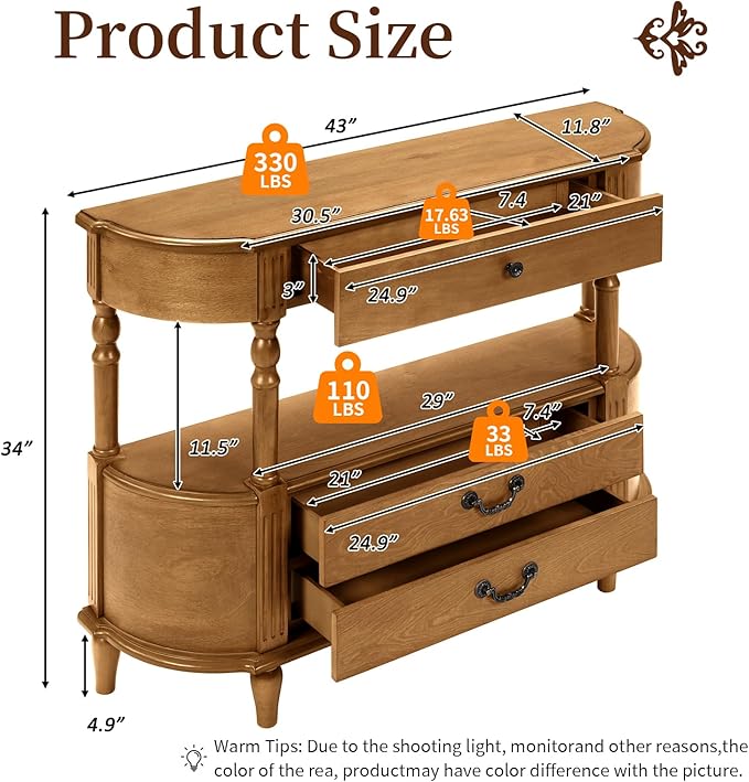 - Half Moon Entry Table with 3 Drawers and 1 Bottom Shelf: Curved Console Table Size: 43"L X 11.8"W X 34"H.It also has 3 drawers and an open bottom storage shelf,providing ample storage space for organizing your everyday items,helping you save space in your home.