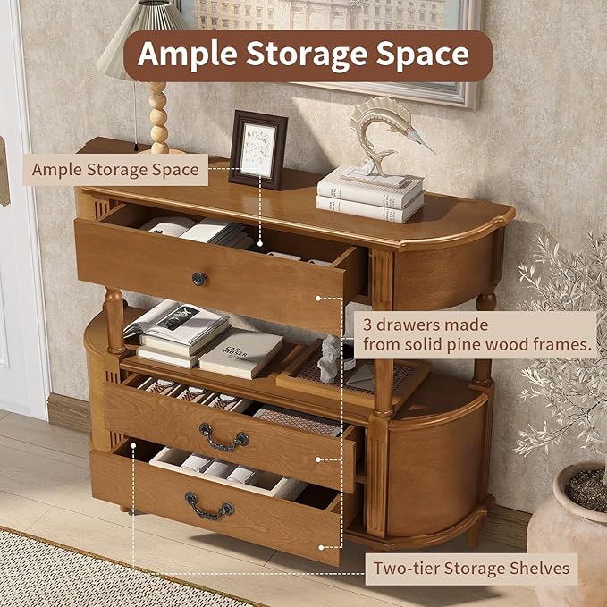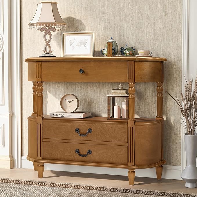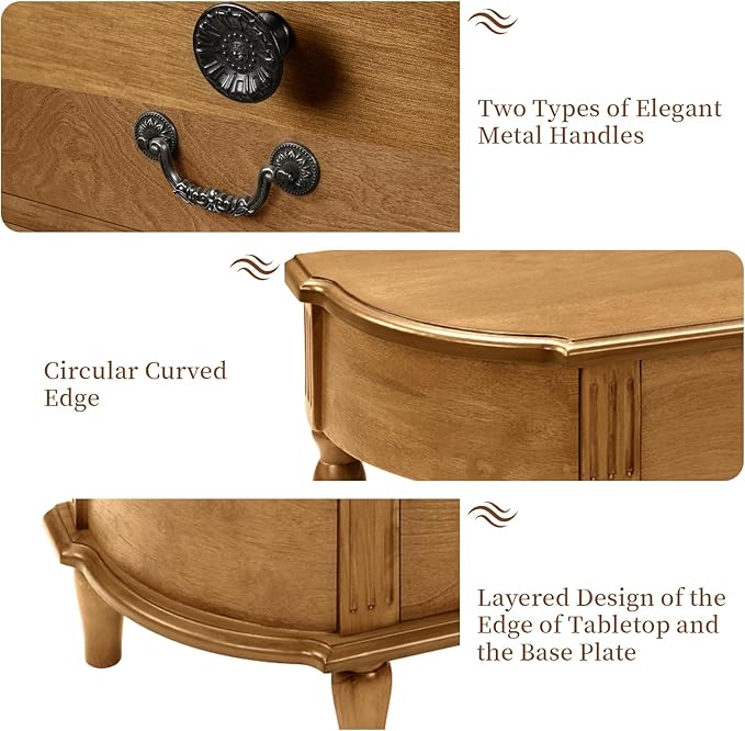 - Exquisite Design: Elegant half-moon shape,curved design on both ends,4 Roman legs,the layered patterns along the tabletop and base edges, paired with the exquisitely carved metal handles on the drawers make this curved console table full of Roman features.Place this exquisite and beautiful retro curved console table in your home,it will become a bright landscape,adding a vintage and elegant atmosphere to your home.