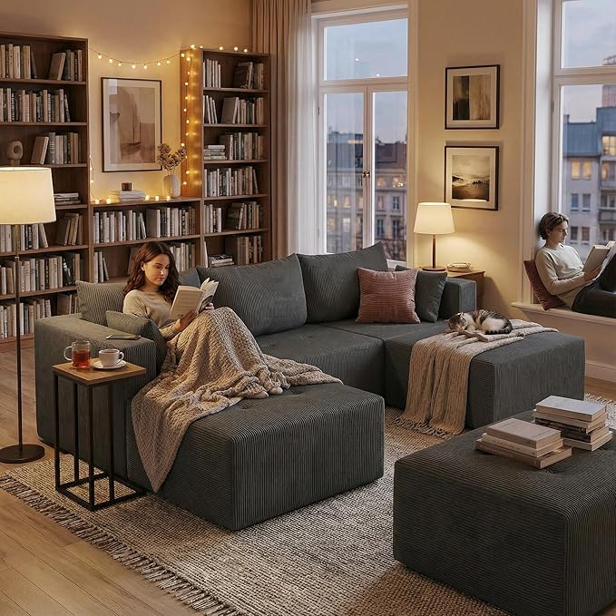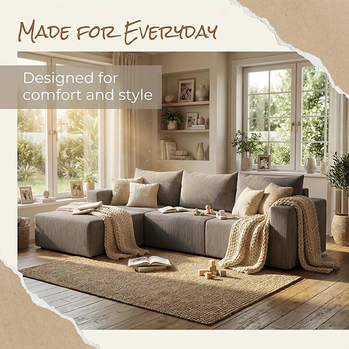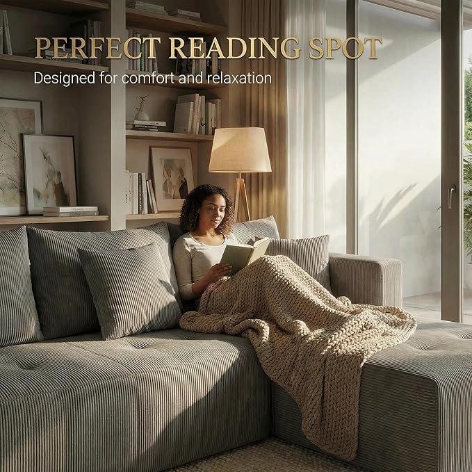 - 【Soft Corduroy Fabric & Durable Quality】: Crafted with upgraded, wrinkle-resistant corduroy fabric, this sectional sofa offers a soft, velvety texture that adds warmth and sophistication to your home. Its high-quality construction ensures long-lasting comfort, making it perfect for all seasons and daily use.