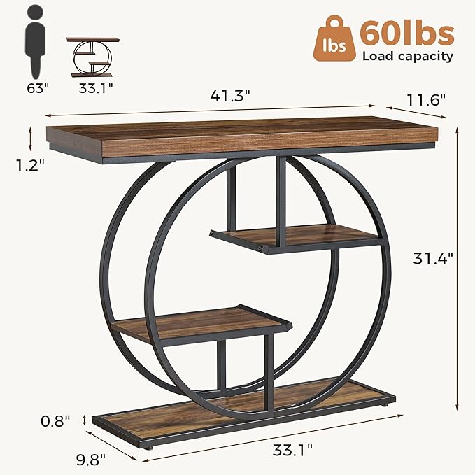 41.3" Sofa Table, Industrial 4-Tier Entryway Table with Circle Base and 1.7" Thickened Top, Narrow Console Table with Storage for Living Room, Hallway, Foyer, Rustic Brown