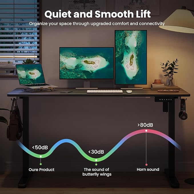 - Smooth Lift: Shift from sitting to standing in near silence. With a noise level below 50 dB, our standing desk motor wonโt startle sleeping pets, interrupt calls, or break your concentration. Glide smoothly between 28" and 47" anytime without disruption.