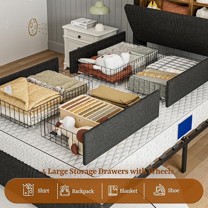 - 4 Lockable Storage Drawers : Features four spacious drawers with smooth-rolling wheels and lockable design, ideal for storing clothes, bedding, and more while keeping your space tidy and organized