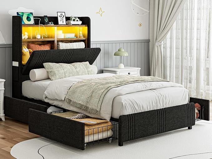 - Special Feature : 4 Large Under-Bed Drawers, Built-In LED Lights & Type-C Charging, Hidden Storage Headboard, Premium Upholstered Design, Sturdy Construction 4 Large Under-Bed Drawers, Built-In LED Lights & Type-C Charging, Hidden Storage Headboard, Premium Upholstered Design, Sturdy Construct… See more