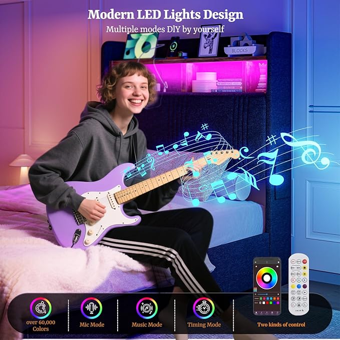 - Convenient Charging Station & LED Lights : Say goodbye to low battery anxiety! Built-in charging station on the storage headboard, equipped with 2 USB ports and 1 Type-C port for easy access to your devices. Elevate your bedroom ambiance with the RGB LED lighting, customizable via remote control or mobile app. You can adjust the color, brightness, mode to create the perfect atmosphere for any occasion