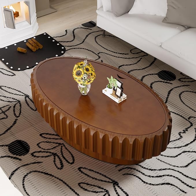 43.3" Oval Drum Coffee Table with Storage Modern Unique Fluted Tea Table Contemporary Wood Oval Coffee Table Centr Table for Living Room Apartment (brown-43.3in)