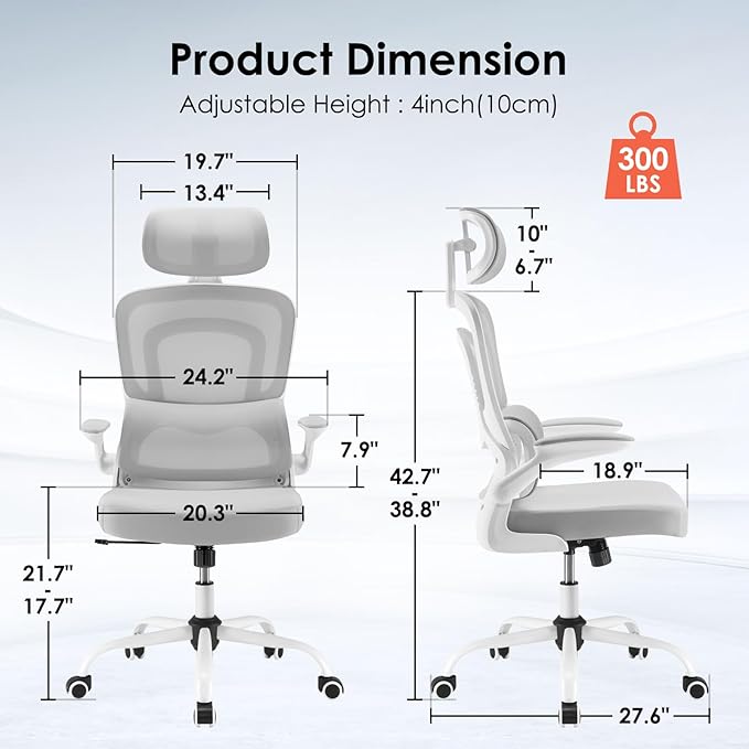 - SAVING SPACE - Maximize your space with our versatile home mesh desk chair. Its flip up armrests allow for effortless storage, enabling you to neatly tuck the chair under your desk when not in use. This space-saving design makes our ergonomic chair a perfect fit for bedrooms, studies, gaming rooms, or offices, ensuring functionality without sacrificing valuable square footage