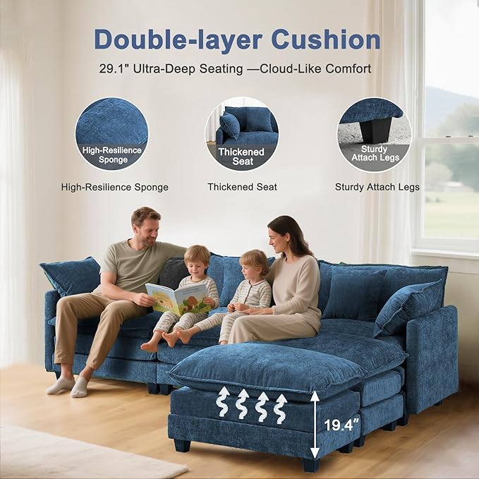 111.4" U Shaped Cloud Couch Sectional with 2 Ottoman|Modular Chenille Sofa with 29.1" Deep Seat|FSC Solid Wood Frame|Easy Assembly & 1YR Guarantee|for Living Room Bedroom Apartment