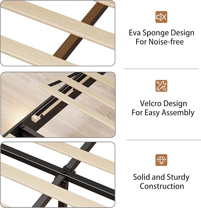 - Noise Free: The queen size wooden bed frame slats are equipped with EVA sponge to achieve a noiseless design. Its tight structure and specially treated joints ensure that no harsh sounds will be made when turning over or getting up, creating a quiet and comfortable sleeping environment for you. Whether it is late at night or early in the morning, you can enjoy a worry-free sleep time.