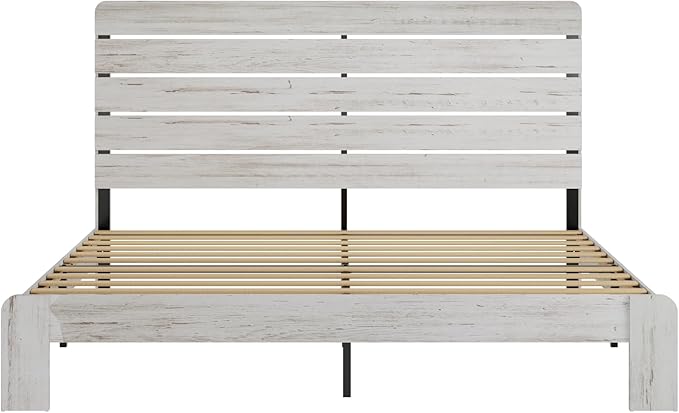 King Size Bed Frame with Wooden Headboard and Footboard, Rustic Platform Bedframe with Wood Slat Support, No Box Spring Needed, Under Bed Storage, Easy Assembly, White