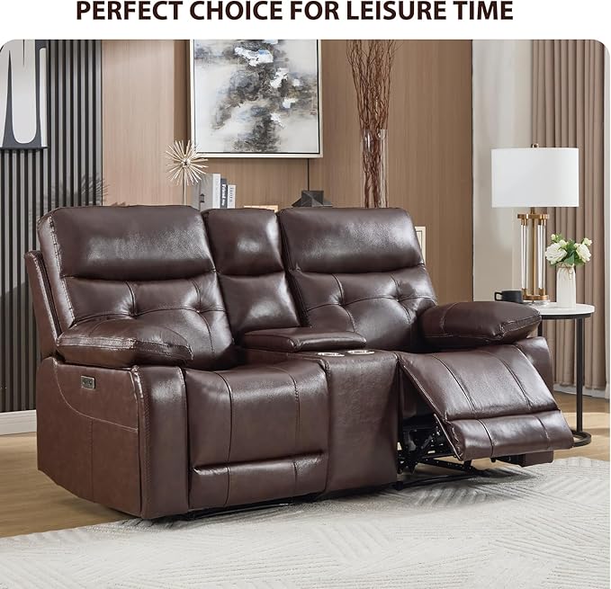 CANMOV Genuine Leather Power Recliner Loveseat, 2 Seat Loveseat Reclining Sofa with Storage Console,Hidden Cup Holders,Modern Electric Recliner Couch Set for Living Room, Bedroom,Dark Brown