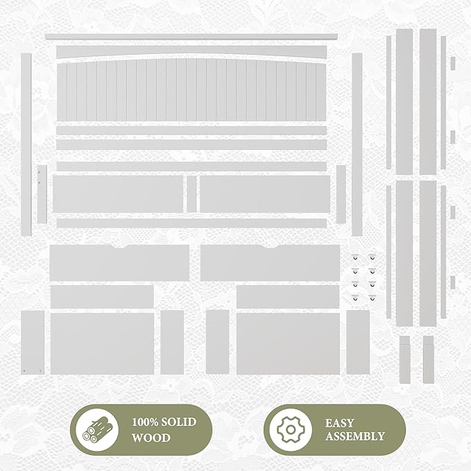 - 【Ultra-Stable 1300lbs Support】 This solid wood bed with drawers has 12 slats, metal connectors, 4 thick solid wood center legs, and a reinforced headboard with noise pads — delivering quiet, rock-solid support for deep, restful sleep
