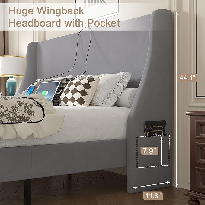 - Upholstered Headboard with Wingback - The wide wingback headboard not only prevents the mattress from slipping and pillows from falling off the bed, but also adds a refined and stylish touch to your bedroom. Upholstered with high-resilience memory foam, offering a soft and breathable surface, ensuring a comfortable backrest experience.