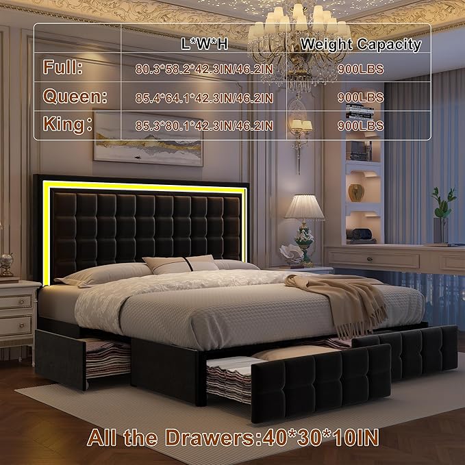 King Bed Frame with LED Lights & Storage Drawers, No Box Spring Needed, Heavy Duty 900lbs Weight Capacity, Easy Assembly, Modern Upholstered Platform Bed, Velvet Black
