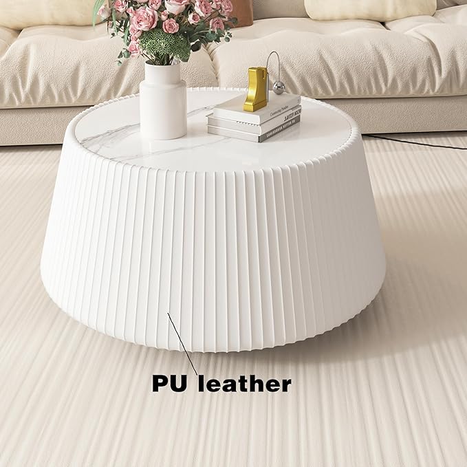 White Round Coffee Table with Sintered Stone Tabletop, 26.77" Drum Coffee Table with Fluted PU Leather Covered and Stable Base, Circle Cocktail Tea Table for Living Room