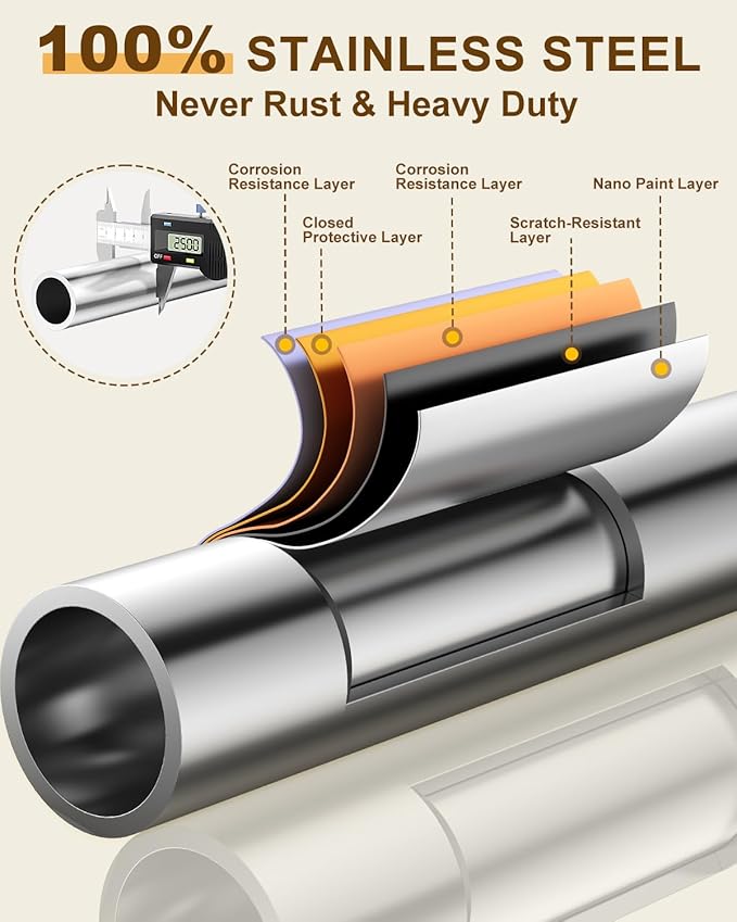 - 100% STAINLESS STEEL STRENGTH - ENJOY 760 LBS & RUST-DEFYING! Boasting an industry-leading 760 lbs weight capacity, 50% stronger than competitors, our NEWEST clothes rack confidently handles your heaviest garments. It features 100% stainless steel design, with even the smallest screws made of the same high-quality material. We've implemented a cutting-edge five-layer coating process, including an extra protective sealant layer, ensuring your rack remains rust-free and resistant to wear and tear.