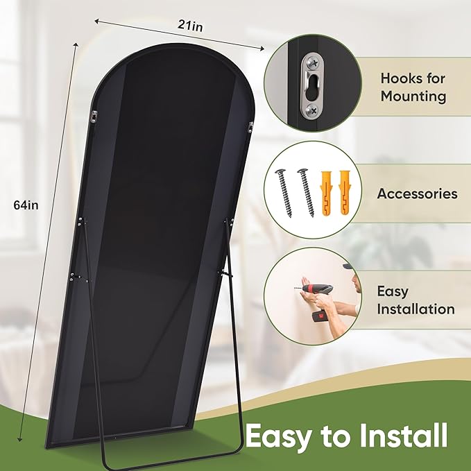 - 【Multifunctional】The wall mirror can be tilted against the wall or installed vertically. You can also unfold the U-shaped bracket and position the arched mirror anywhere. The hook on the back of the tall bedroom mirror is suitable for almost all indoor and outdoor locations, fulfilling all your usage requirements.