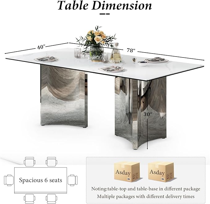 Asday 78-Inch Sintered Stone Rectangular Dining Table, Large Kitchen Table with Chrome Triangle Stainless Steel Double Pedestal for Living Room, Kitchen, Dining Room, White and Silver