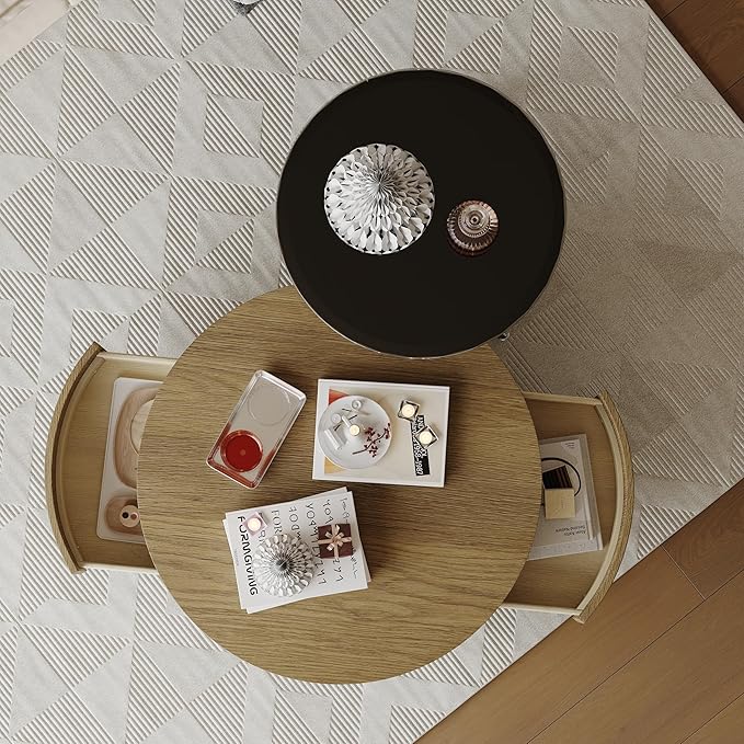 - ⭐【Hidden Storage Drawers】 The round coffee table includes two fully concealed drawers for organizing remotes, chargers, books, and everyday items, helping maintain a clean and clutter-free living room.