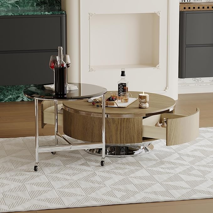- ⭐【Modern Coffee Table & Side Table Set】 A coordinated walnut-and-silver table set featuring a round coffee table and a mobile rolling side table, designed to elevate modern living rooms, apartments, and contemporary spaces.