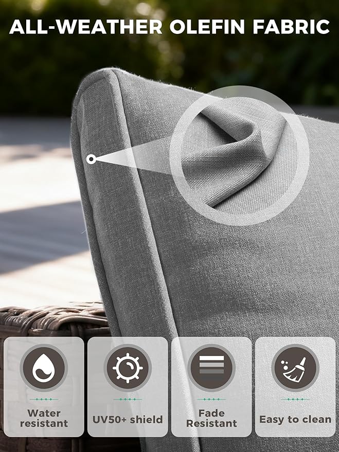 - Easy-Clean Care for Lasting Beauty: Keep your wicker patio furniture set looking fresh with ease. The fade-resistant cushion covers are removable and machine washable, allowing for a quick clean. For long-lasting beauty, we recommend storing cushions indoors during extended rain, as the inner foam is designed for comfort, not waterproofing.