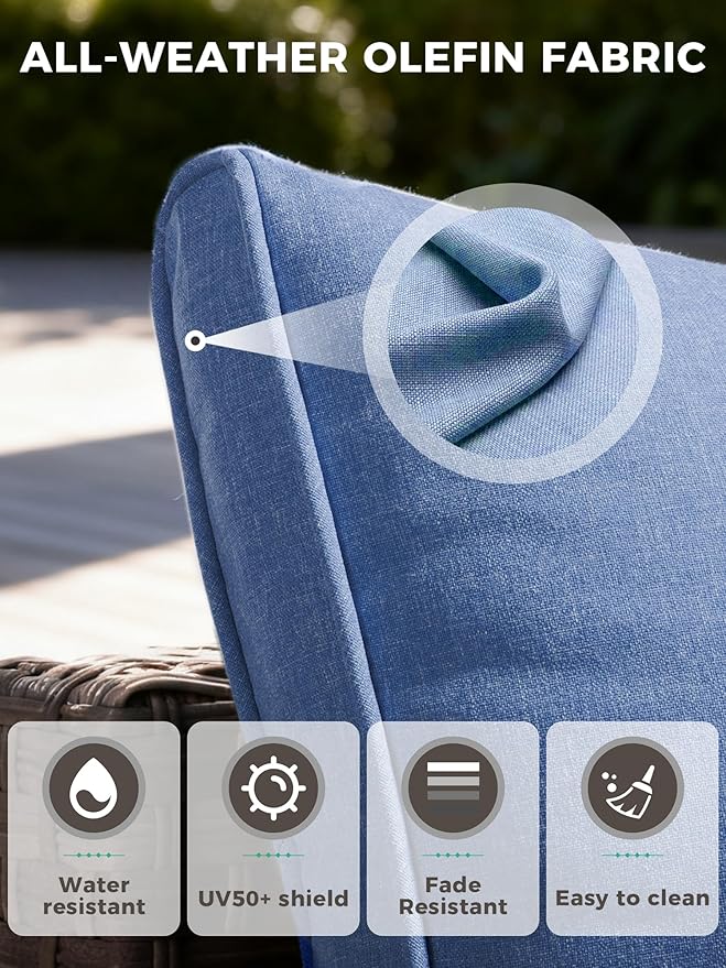 - Easy-Clean Care for Lasting Beauty: Keep your wicker patio furniture set looking fresh with ease. The fade-resistant cushion covers are removable and machine washable, allowing for a quick clean. For long-lasting beauty, we recommend storing cushions indoors during extended rain, as the inner foam is designed for comfort, not waterproofing.