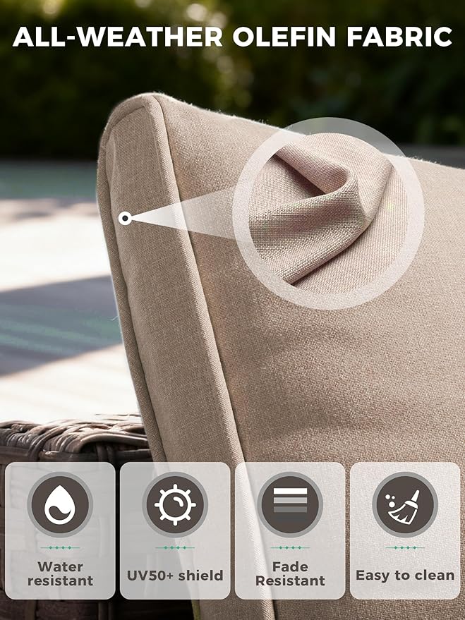 - Easy-Clean Care for Lasting Beauty: Keep your wicker outdoor furniture set looking fresh with ease. The fade-resistant cushion covers are removable and machine washable, allowing for a quick clean. For long-lasting beauty, we recommend storing cushions indoors during extended rain, as the inner foam is designed for comfort, not waterproofing.
