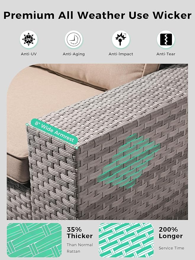 - All Weather High-quality Materials: Crafted with hand-woven, premium PE rattan, this outdoor patio furniture set is built to withstand harsh sunlight, rain, and moisture without fading or cracking. The heavy-duty 18 mm powder-coated steel frame offers superior rust-proof stability, ensuring your investment lasts for seasons to come.