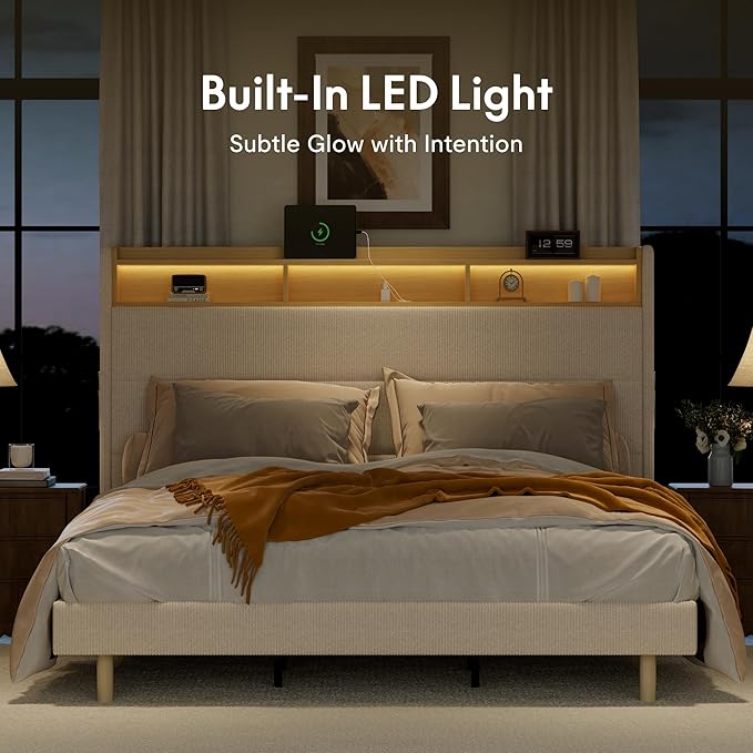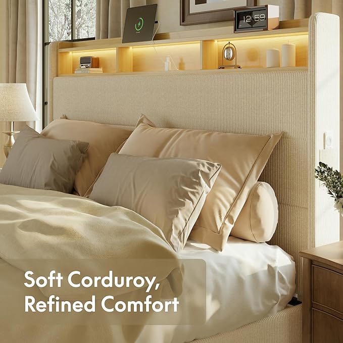 FLEXISPOT King Platform Bed Frame with 51" Tall Upholstered Corduroy Headboard, Two-Tier Storage Shelves, LED Light & Charging Station, Remote Pocket, No Box Spring Needed,1100Ibs Heavy-Duty, Beige
