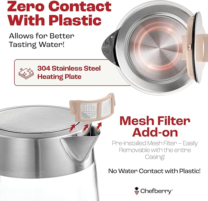 - No Plastic - 100% stainless steel water-contact paths: no plastic in the spout or filter, ensuring pure taste and safe heating, Includes a removable plastic mesh FIlter
