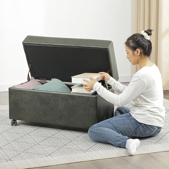Joveco 32" Faux Suede Storage Ottoman Bench with Wheel, Rectangle Foot Rest Stool for Living Room, Bedroom, Entryway,Moss Green