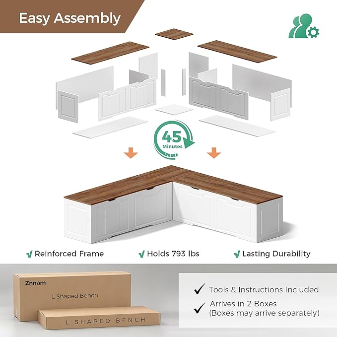 - Space-Saving Corner Bench with Built-In Storage: This 63" L-shaped bench is specifically designed to transform awkward, unused corners into functional and stylish spaces. Perfect for small kitchens, cozy breakfast nooks, or cramped entryways, it delivers built-in seating without eating up your precious floor space. Maximize every inch of your home!