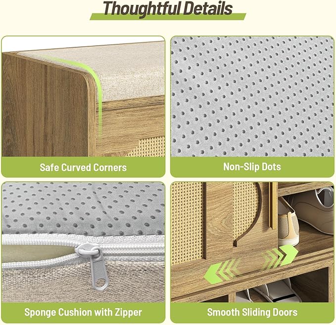 - Thoughtful Design: This shoe rack features a 2'' thick sponge cushion for soft, supportive seating. The cushion base is equipped with non-slip texture to keep it securely in place, and the cover features a convenient zipper for quick removal and easy cleaning