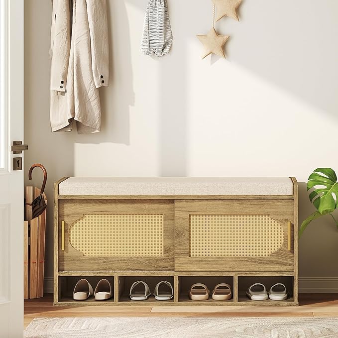 39.4" Wide Shoe Storage Bench, 2-Tier Rattan-Style Shoe Bench with Cushion Seat and 4 Open Compartments, Double Sliding Door and Adjustable Shelves, for Entryway, Hallway, Natural Pecan