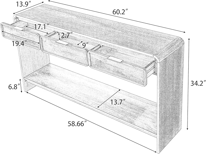 - Living Room Sofa Table with Storage: Designed for everyday convenience, the table includes 3 drawers for storing keys, jewelry, or small household items. The spacious lower shelf—measuring 58.66" × 13.7"—provides ample room for books, baskets, or décor pieces, helping keep your home tidy while showcasing your personal style