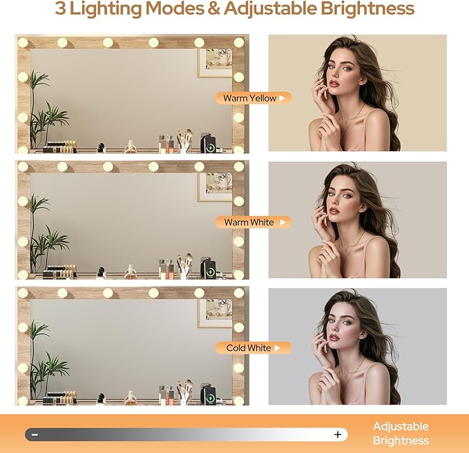 • 12 Hollywood-Style Bulbs: Equipped with 12 bulbs, this vanity table delivers brighter, more even, and shadow-free illumination. With 3 color temperature modes and adjustable brightness, the large vanity provides professional-grade lighting to help you achieve a perfectly precise and flawless makeup application every time.
