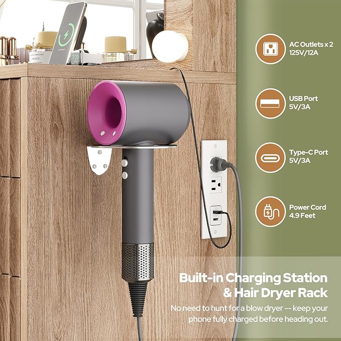 • All-in-One Charging Station: This dressing table features 2 AC outlets and 1 USB port, 1 type-c port to power all your devices simultaneously. The dedicated hair dryer holder keeps your dryer within reach, eliminating frantic searches. Streamline your morning routine and transform busy mornings into moments of organized calm.
