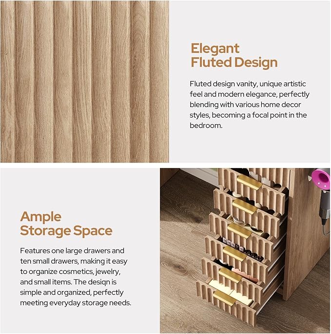• Artistic Fluting & Tempered Glass Top: Distinct fluted panel design enhances the dressing table with a sense of depth and style. Also the vanity features a high-strength tempered glass surface, allowing you to see the contents of the top drawers at a glance—no more searching. It combines practicality with display elegance.