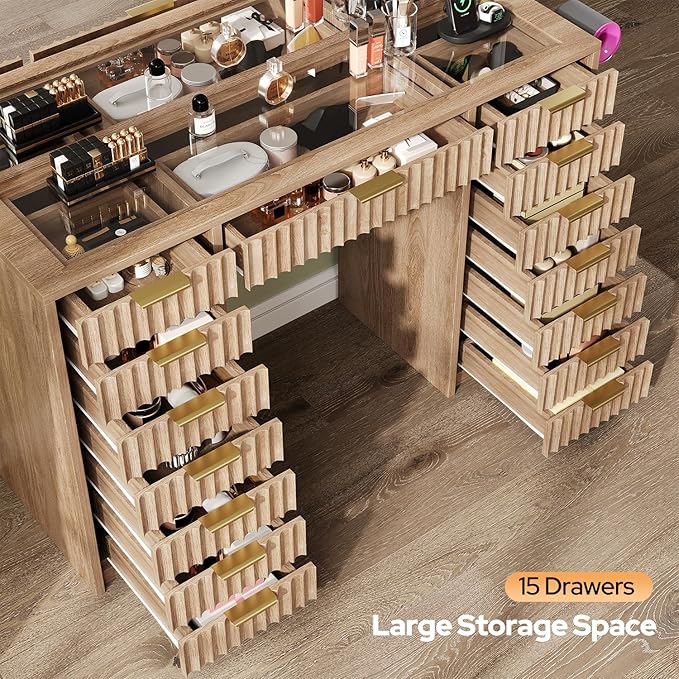 15 Drawers Fluted Vanity Desk with Glass Top, 47" Makeup Vanity with Large Mirror and 12 LED Lights, Dressing Table with Power Outlet for Bedroom, Natural