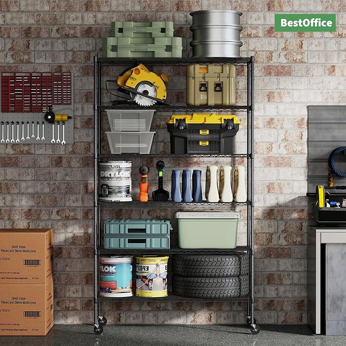 BestOffice Storage Shelves 6 Tier Metal Shelves Adjustable Garage Shelving Wire Shelving Unit Capacity 2100LBS with Wheels for Kitchen, Garage Pantry Closet Commercial,Black