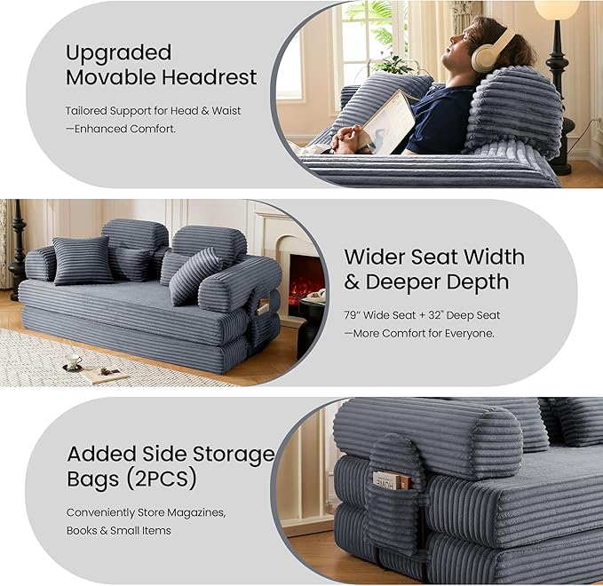 - Multifunctional Space-Saving Design: This 79'' convertible sofa bed transforms effortlessly between a lounge couch, a comfortable loveseat, a supportive sleeper bed, and a versatile futon.