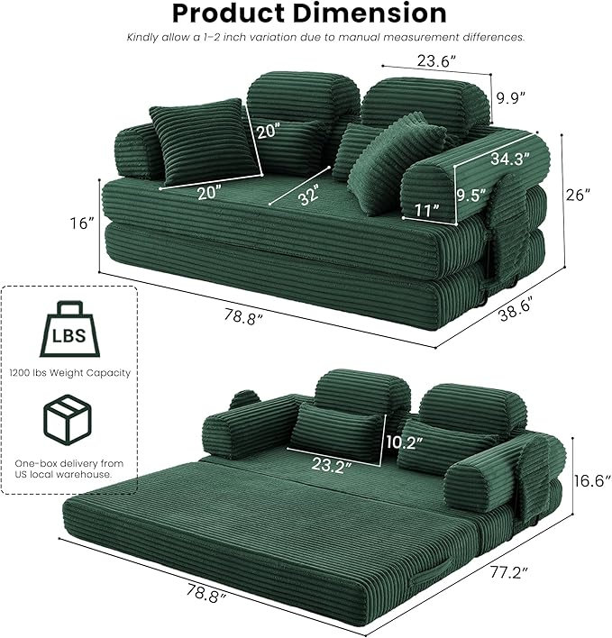 Convertible Sofa Bed,79'' Foldable Sleeper Lounge Modular Couch Comfort Compression Sofa Loveseat for Small Spaces Comfort for Apartment Bedroom (Corduroy Fabric, Dark Green1)
