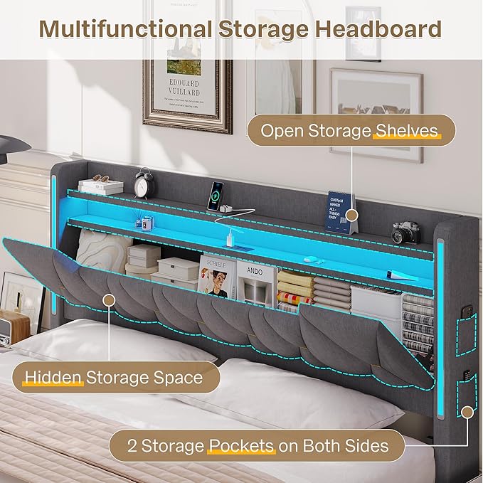 • 【Spacious Storage California King Bed Frame】This california king bed frame is designed with functionality in mind, featuring 2 open storage shelves for easy-access items, a hidden storage cabinet for secure personal belongings, and 4 small side storage pockets perfect for phones and remotes. A truly versatile california king bed frame with storage